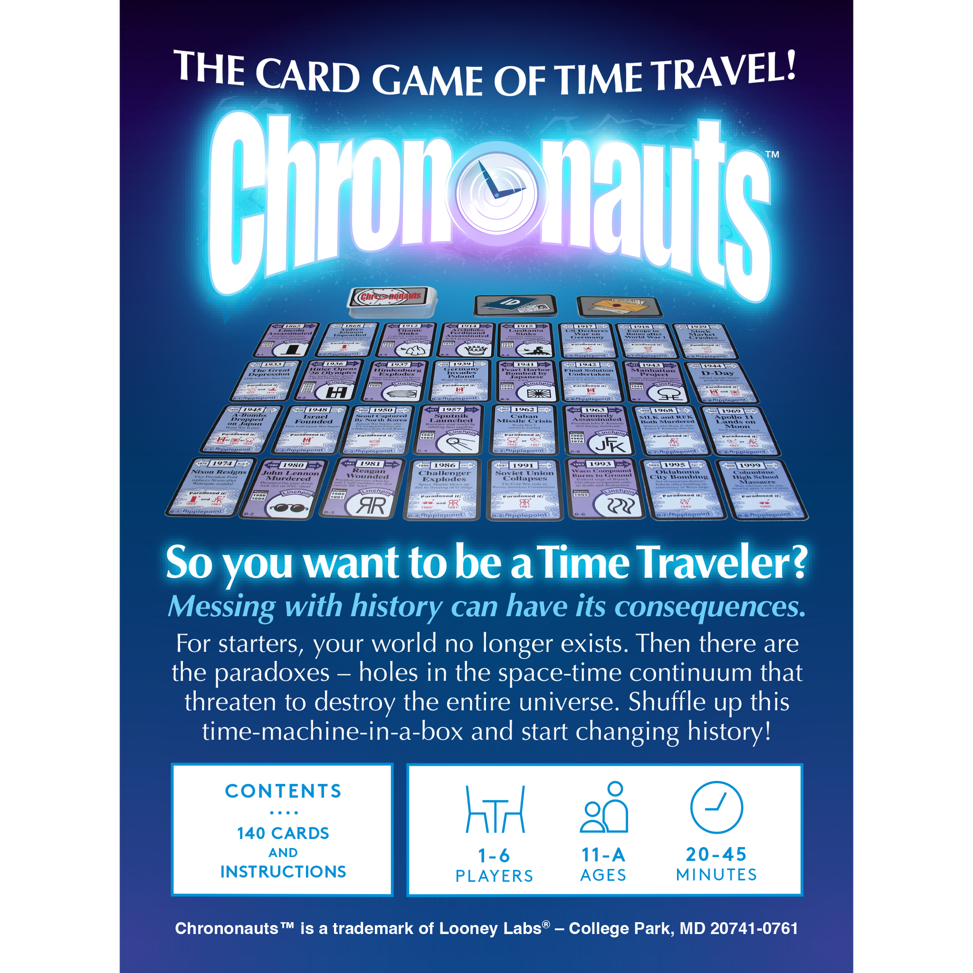 What would YOU do with a Time Machine? Would you stop the sinking of the Titanic? Prevent the assassination of JFK? Kill Hitler before WWII? These are just a few of the possibilities in Chrononauts, the award-winning card game of time travel. To win, you must change history at key points called Linchpins, so that history transforms into the Alternate Reality your character calls home.