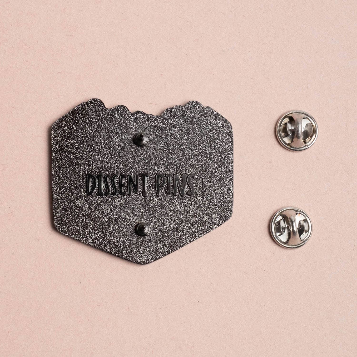 2" wide x 1.75" tall Hard Enamel Double clasps for secure hold Text: Olivia Gemarro Art: Aly Bellissimo This pin has small parts and is not made for children!