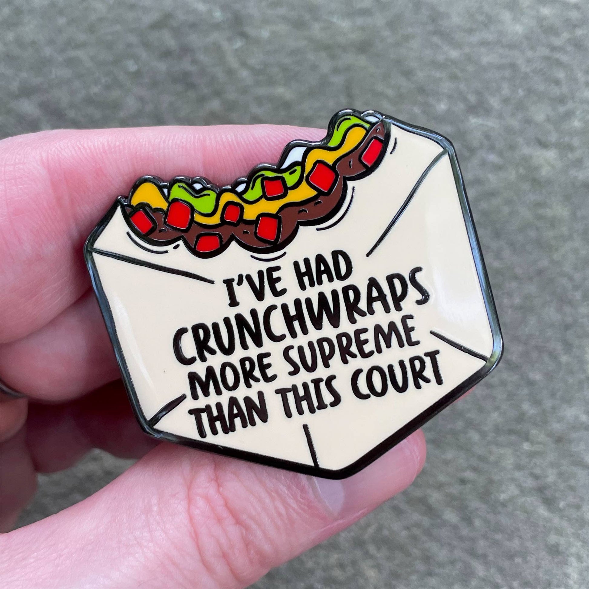 Back before Twitter was X, we saw a tweet that captured how I feel about our current Supreme Court: "I’ve had Crunchwraps more supreme than this court." We reached out to Olivia Gemarro, who came up with this brilliant tweet, and she agreed to partner with us. We hired our friend Aly Bellissimo, illustrator extraordinaire, and now you can wear Olivia's tweet on your lapel, bag, or jacket! If you're feeling like our highest court is lower than fast food, grab this pin!