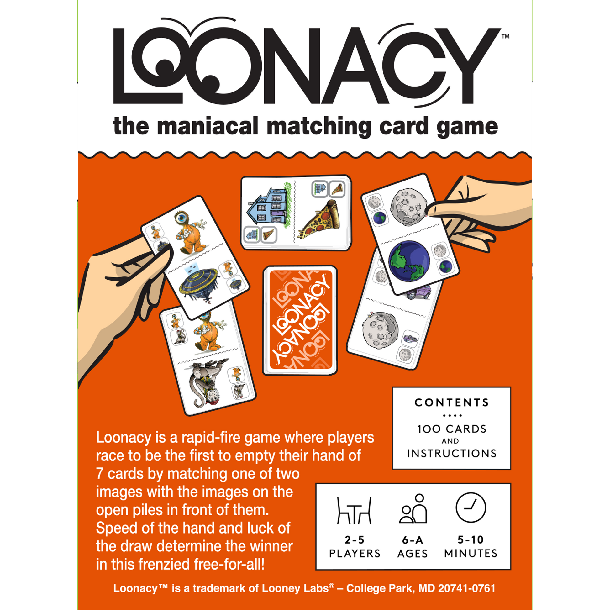 Loonacy is a rapid fire game where players race to be the first to empty their hand by matching one of two images with the images on the open piles in front of them. It’s easy enough to teach in a single sentence, and so addictive you can’t play just one game. Speed of the hand and luck of the draw determine the winner in this frenzied free-for-all!